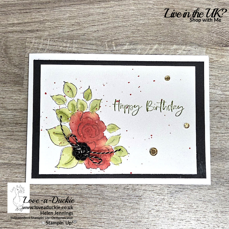 This image of roses from the Charming Day stamp set was stamped onto Fluid 100 Watercolor Paper with Stazon ink. Then using a water painter and Poppy Parade ink, I added colour to the roses and Old Olive ink for the leaves. Once dried, I used a pencil to accentuate the detailing lines. The sentiment was also stamped in Old Olive ink. Some splatters were added with Poppy Parade ink.