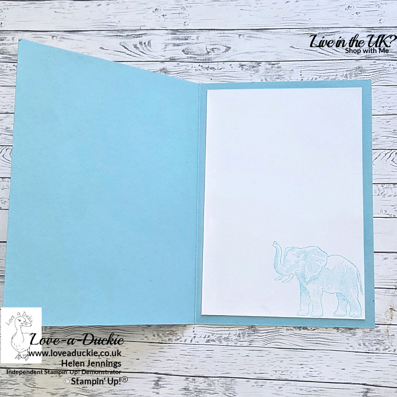 The background panel has been stamped repeatedly using Balmy Blue ink to create a soft patterned effect featuring the elephant image. This keeps everything cohesive while adding gentle detail without overwhelming the design.
