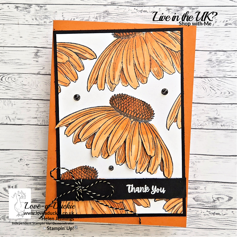 A black mat behind the stamped white panel helps frame the design and makes the Pumpkin Pie colour stand out even more. A few subtle dark embellishments finish the card without distracting from the main floral pattern.