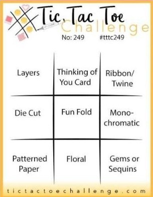 For this hop we are all using a Tic Tac Toe Challenge as our inspiration. I have used the column, ribbon/twine; monochromatic; gems or sequins.