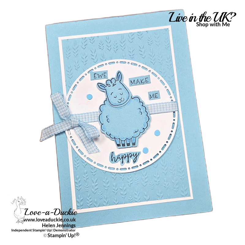 The Balmy Blue panel has been embossed with the Gathering Leaves 3D Embossing Folder. The lamb was stamped onto Balmy Blue card with Memento ink. The stamp set does include a stamp that will add colour to the sheep’s body, but for this little chap, I just added some shading with a Balmy Blue watercolor pencil.