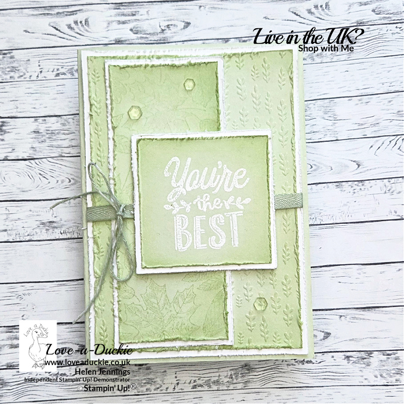 I stamped a panel of Soft Sea Foam card with Soft Sea Foam ink and the Etched Autumn Background stamp. Keeping the ink and cardstock the same shade gives a lovely soft, almost tone-on-tone effect. I again matted this onto a distressed Basic White mat.