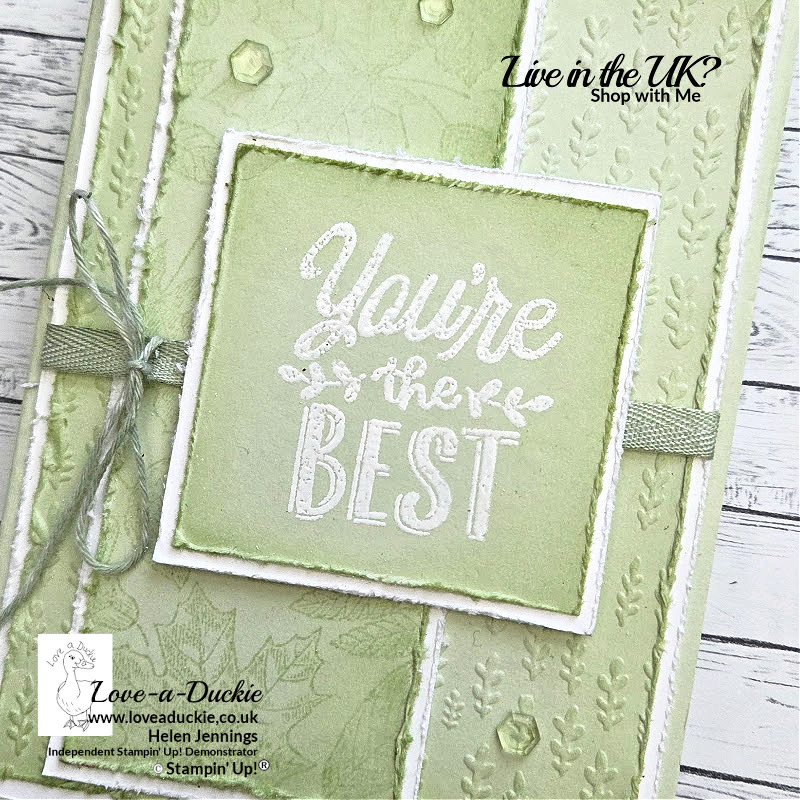 Once these mats had been stuck together I wrapped some ribbon around them and then added a bow of twine. Both the white ribbon and the white twine had been coloured with a Dark Soft Sea Foam Stampin’ Blend.