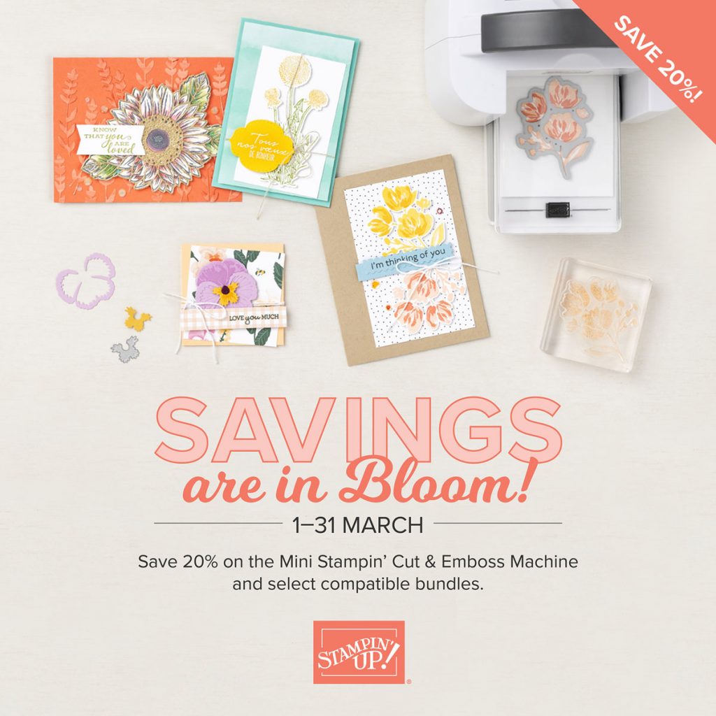 The Garden Wishes Bundle that I have used, is one of the bundles currently on offer as part of the “Savings Are in Bloom” promotion that is currently running. The mini Stampin’ Cut & emboss Machine and 13 stamp/die bundles are all available at 20% off. Check out all the options here.